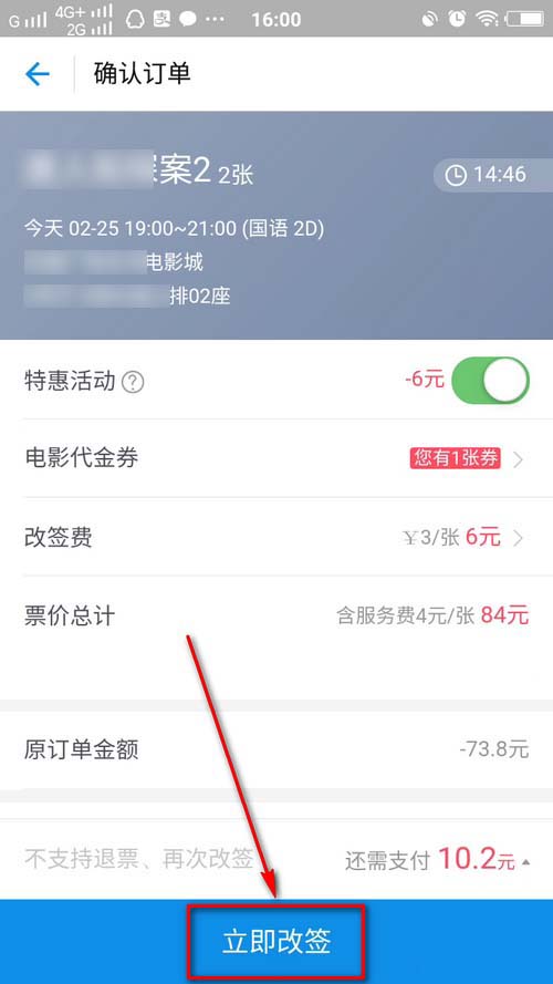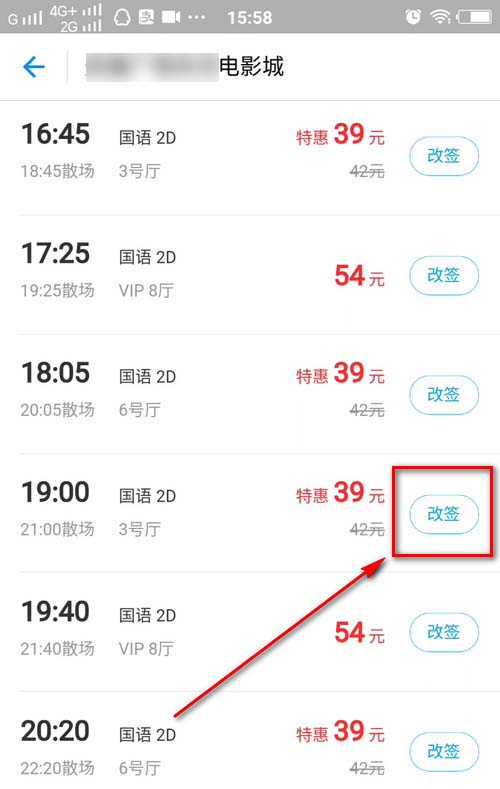 5、页面弹出同场电影的其它时间,选择需要改签的时间,点击【改签】。