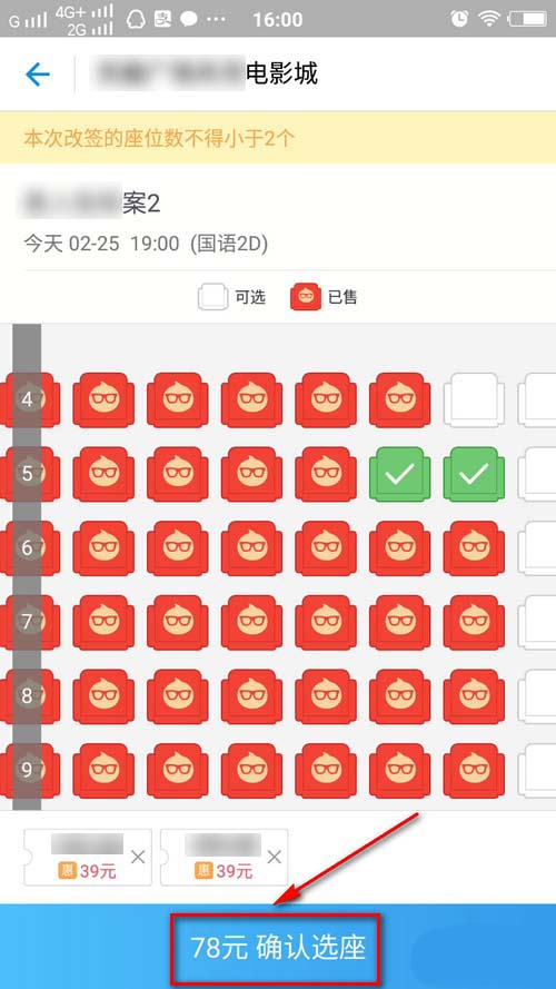 6、重新选择改签场次的座位,选好后,点击【确认选座】。