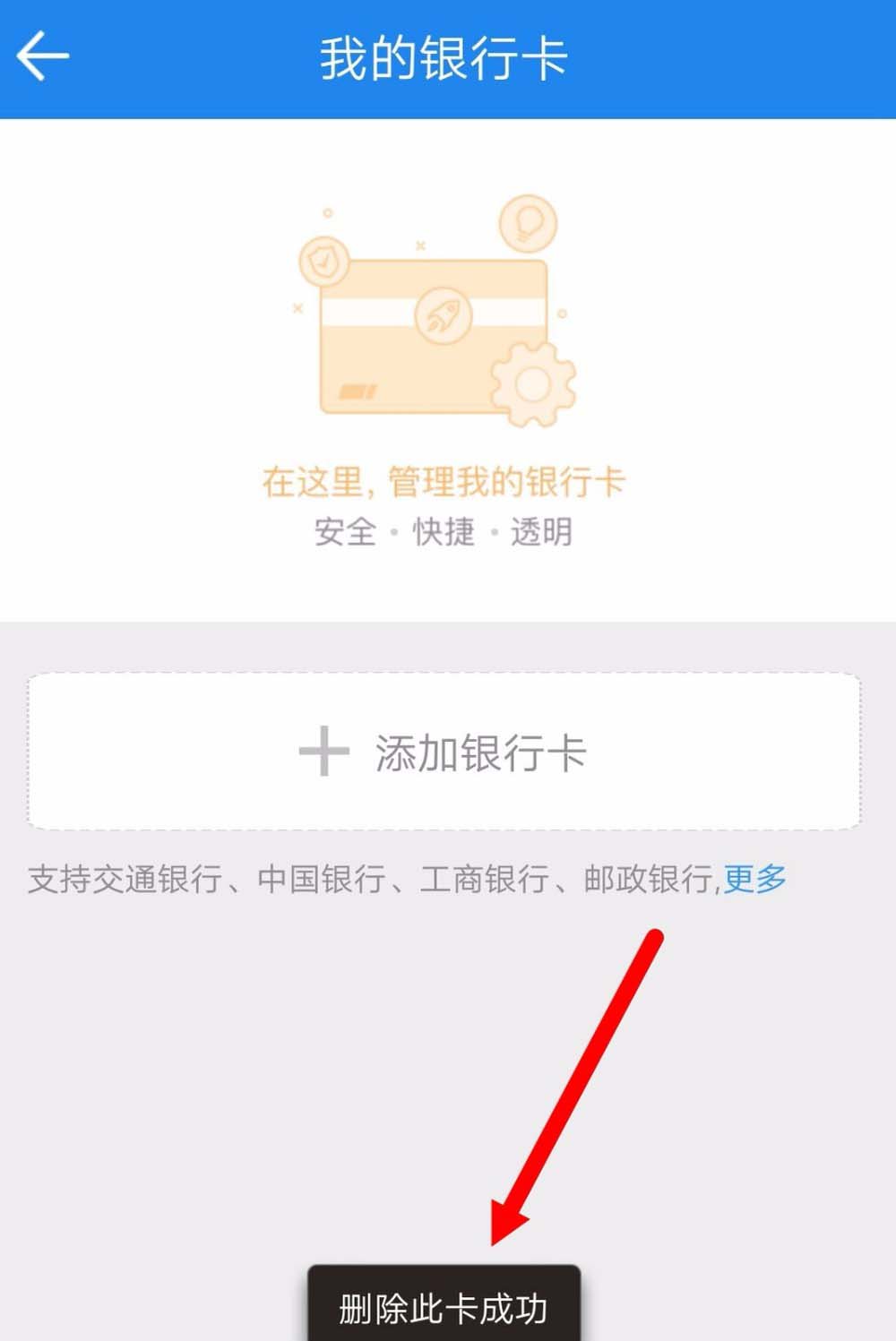 7、解绑成功界面会提示你删除成功,这样银行卡就不会再显示了。以后需要使用时再次绑定即可。