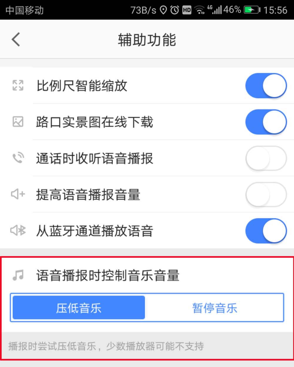 6、最后就是语音播报的时候,控制音乐了。大家也根据自己的需要设置一下。看看是需要压低音乐还是直接把音乐暂停了。