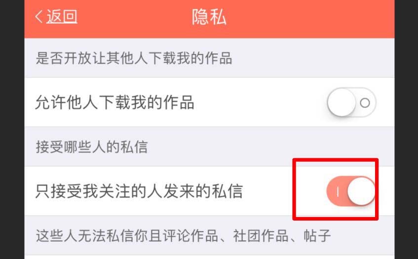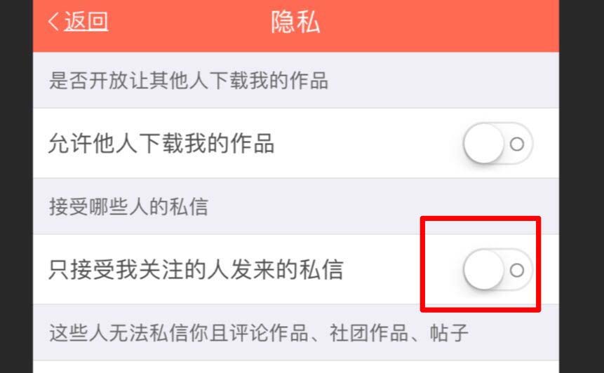 5、将透明功能按钮变成橘红色即是开启了“只接受我关注的人发来的私信”意思就是说,只要你关注的人才能给你发私信。