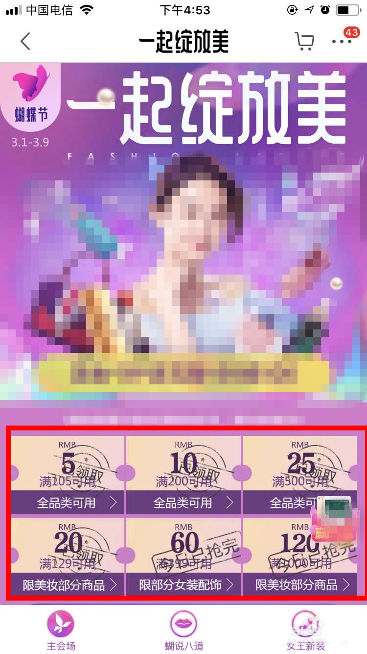 2、在首页点“蝴蝶节 女人如花”,进入“蝴蝶节”的活动页面后,在左上角会看到“蝴蝶节”以及“3.1-3.9”的字样,下方就可以看到一共有六种不同的优惠券。