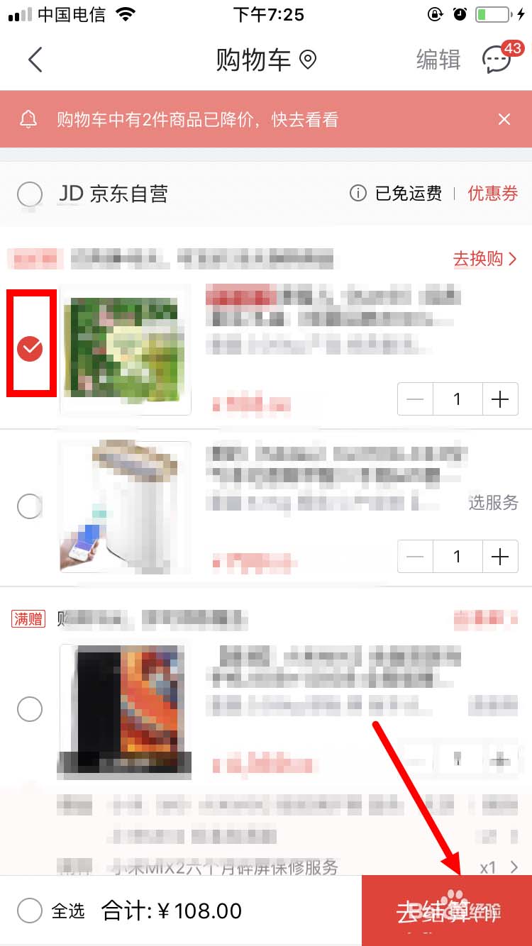 2、进入购物车页面,确保购买的商品前面已经选好打钩,再点“去结算”。