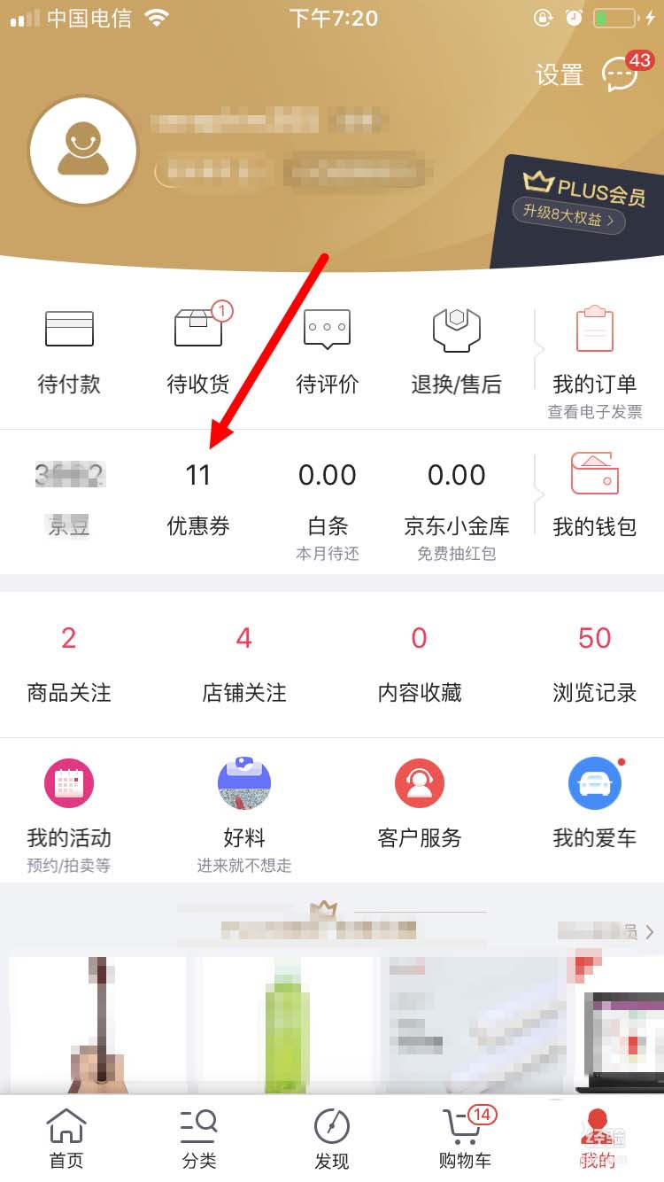 2、在“我的”页面中间部分,找到“优惠券”,并点进去。
