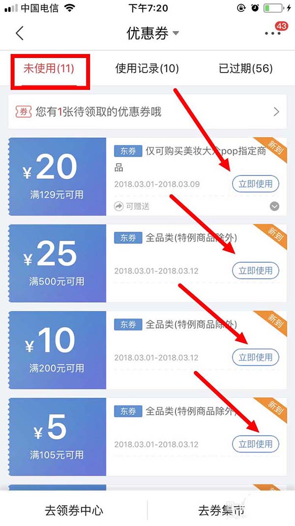 3、在“优惠券”页面的“未使用”栏目下,就可以看到刚刚领取的优惠券。然后,点某一个优惠券右侧的“立即使用”。