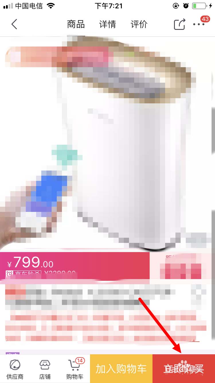 4、这时,会进入可以使用这张优惠券的商品页面。然后在选择好的商品详情页面,点“立即购买”(也可以先加入购物车)。