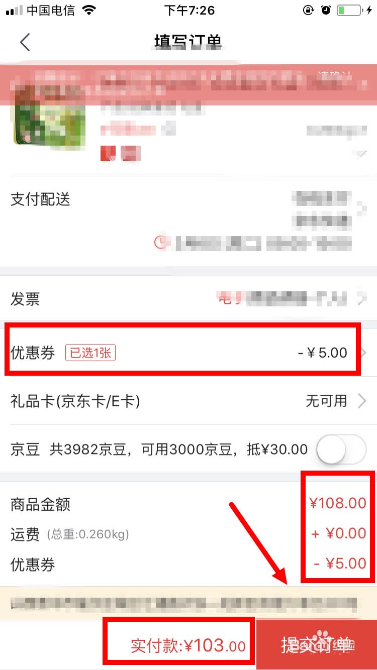 3、最后在“填写订单”页面,可以看到已选择的优惠券,商品金额以及最终的价格,点“提交订单”,选择支付方式进行支付就可以了。