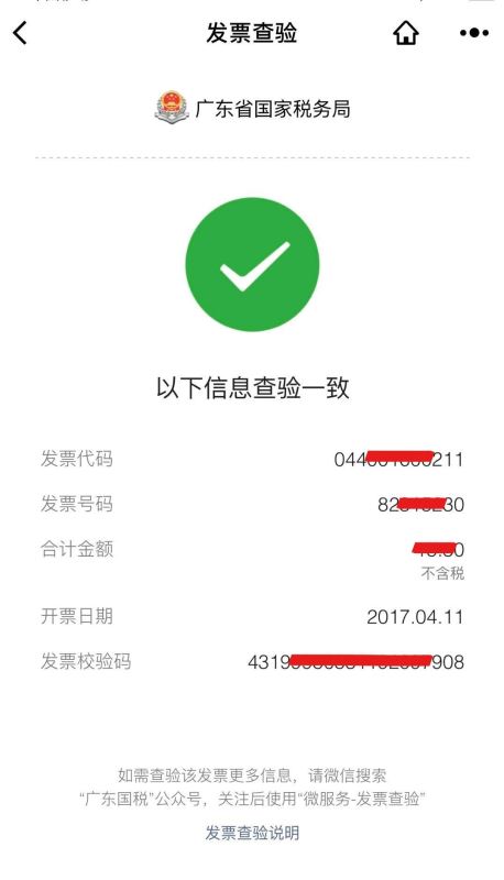 “微信扫一扫发票查验”可查询发票信息中的4-5项信息,如果需要查询发票票面的更多信息,可关注广东国税微信公众号-微服务中进行查验。