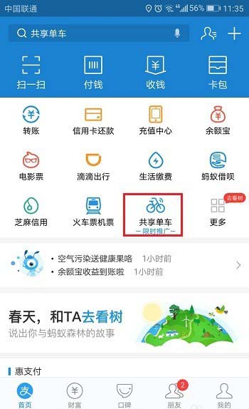 1、在我们的手机里面打开应用,进去首页之后,点击共享单车,如下图所示: