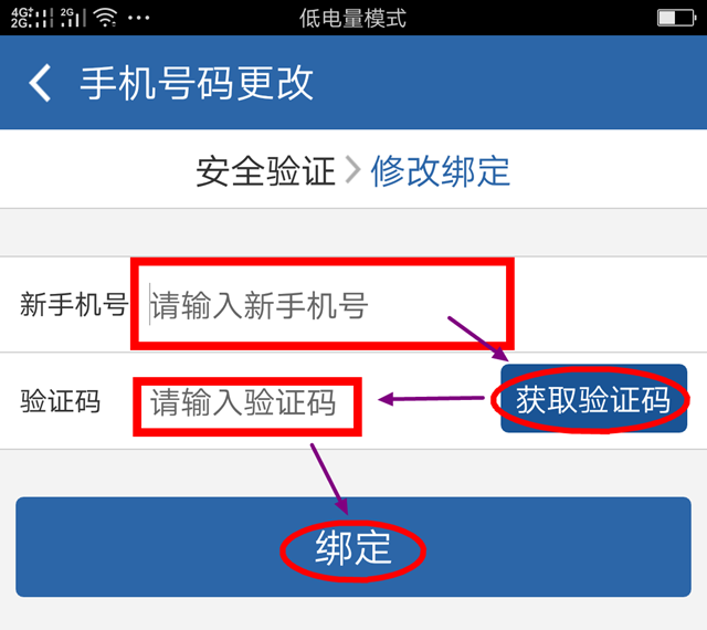6、接着根据提示,输入“新手机号码”并通过“验证”之后,点击“绑定”即可;