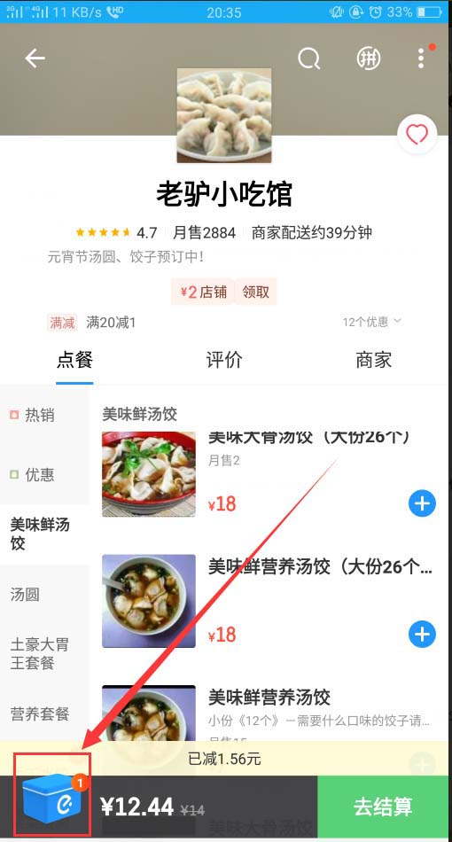 3、选择你要购买的商品,然后点击左下角付款金额旁边的饿了么图标。