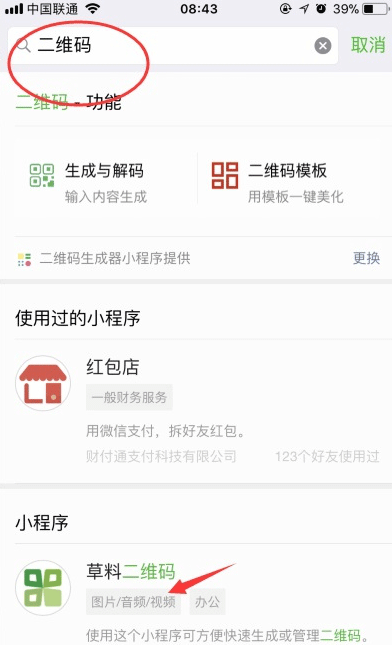 第二步:然后在小程序中搜索“二维码”然后点击进入生成二维码小程序,如下图所示。