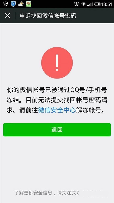 设置了前面三道安全防线后,你的微信钱包安全性已经超过了99%了,即便是遇到黑客,对方要破解前面三道安全防线也是需要大量的时间,甚至基本是无法破解的。为了保障微信钱包中的资金绝对安全,还可以第一时间在家人手机或电脑中,打开微信安全中心,登录自己账号进行对微信账号冻结。