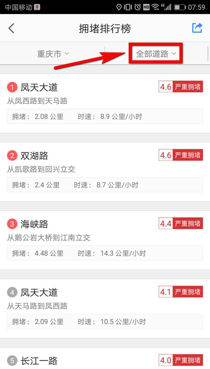5、点击拥堵排行之后就进入到该页面中了,在该页面中就能看见当前最拥堵的路段名称、拥堵指数、拥堵长度以及当前的通过时速了。如果想对路段进行筛选,那么就可以点击图示位置的【全部道路】。
