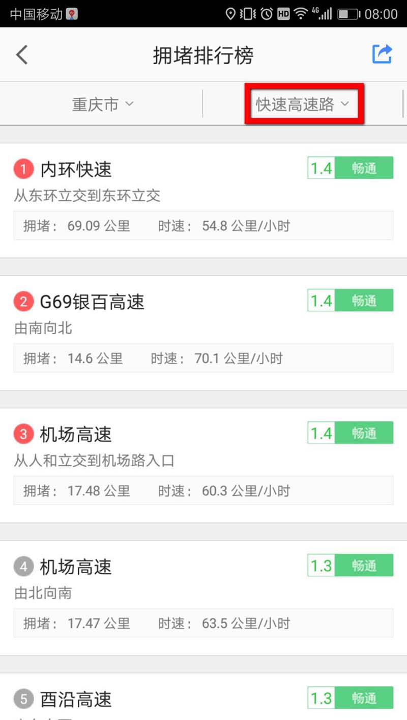 7、这时,页面上的排名就变成了快速高速路的拥堵指数排名了。