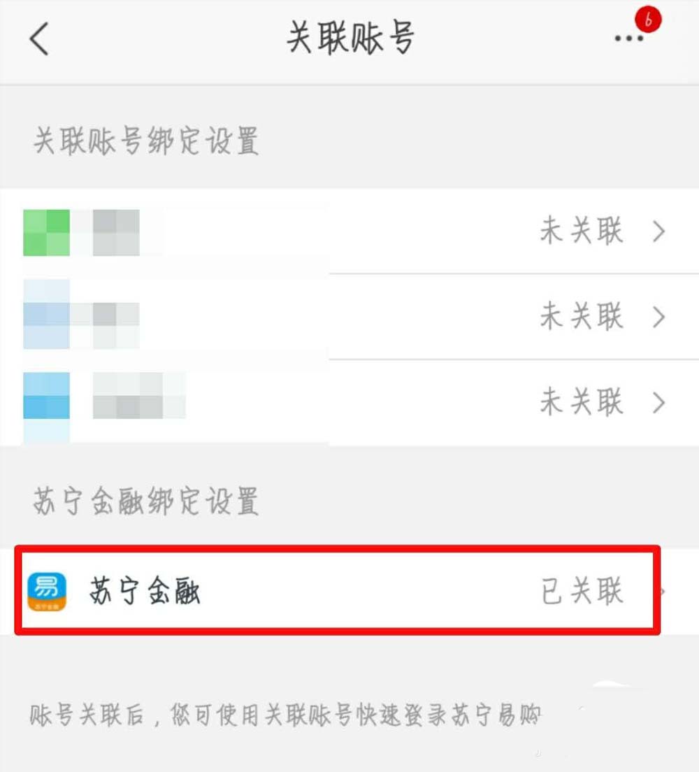 4、在关联账号页面点击已经绑定的【苏宁金融】。