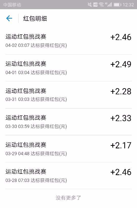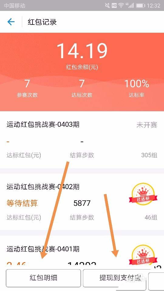 4、然后点击下面的“红包明细”就可以查看我们的历史跑步收入情况。同时,我们还可以提现这些奖金,如图所示~