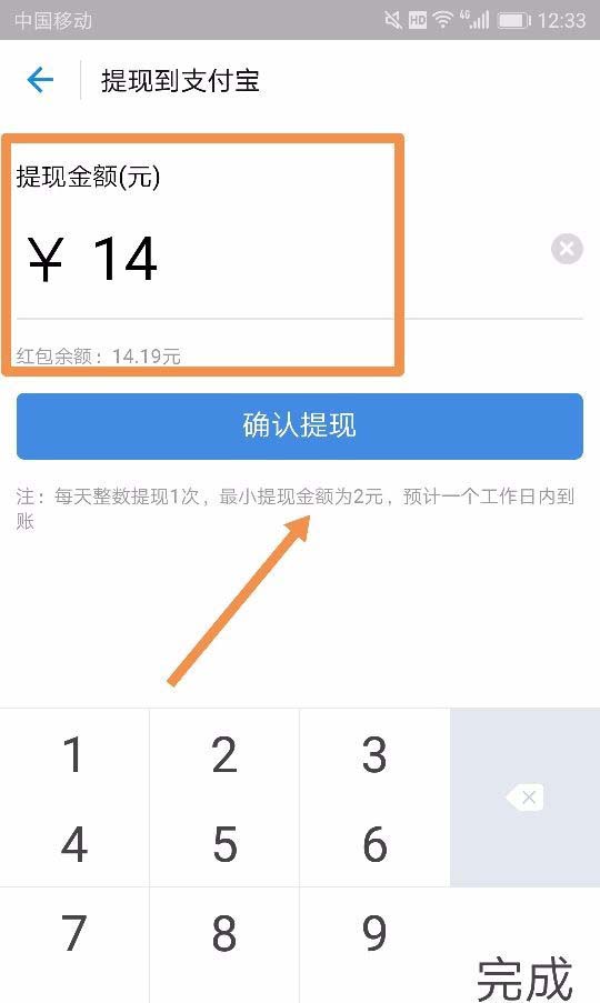 6、当我们呢想要提现的时候,我们点击广告出现的那个“提现到支付宝”的按钮,输入自己想要提现的金额,点击“确定提现”,然后我们就可以提现了。值得注意的是,提现只能是大于2元的整数,如图所示~