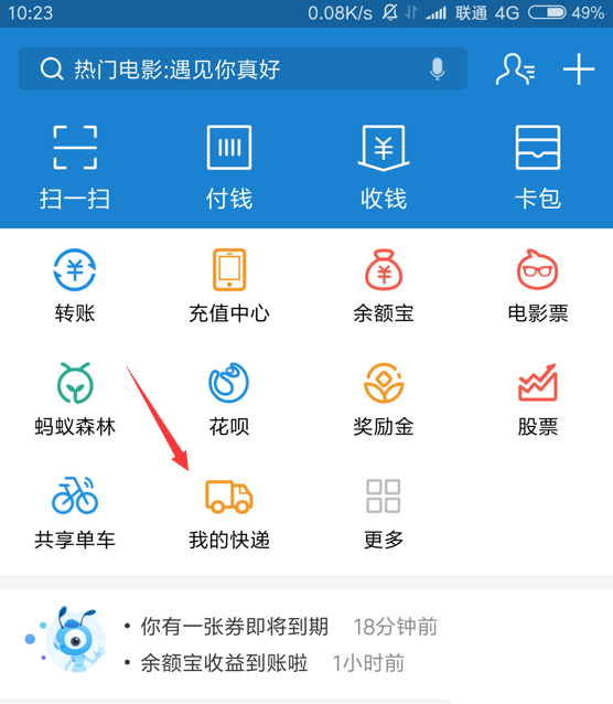 1、首先,我们点击打开支付宝钱包,在如图所示位置有我的快递,我们点击打开我的快递