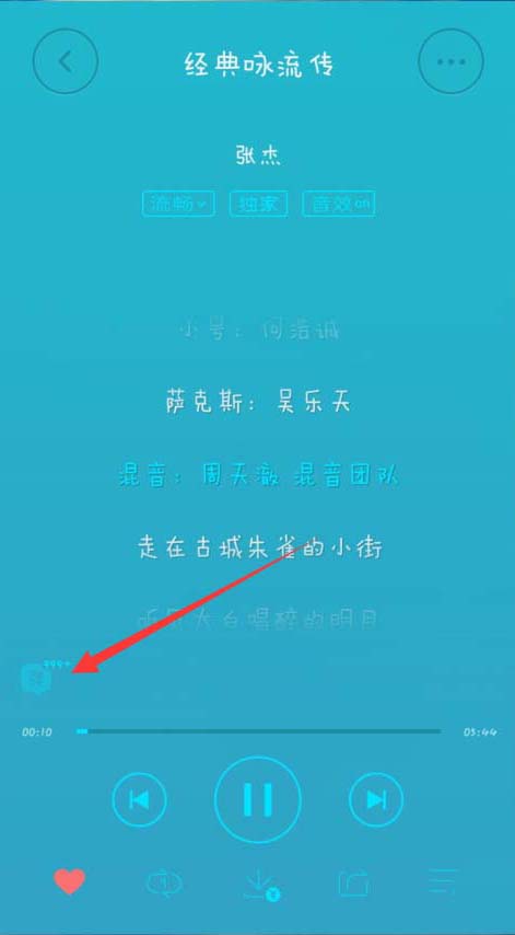3、打开弹幕。我们打开一首歌以后,然后切换到歌词界面上,然后,我们会在左下角看到一个“弹”,我们要做的就是点击“弹”,然后,打开弹幕。