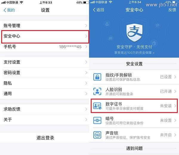 二、在支付宝设置中,点击进入「安全中心」,然后再点击「数字证书」,只要按照了数字证书,就可以提升单日余额支付宝额度,如下图所示。