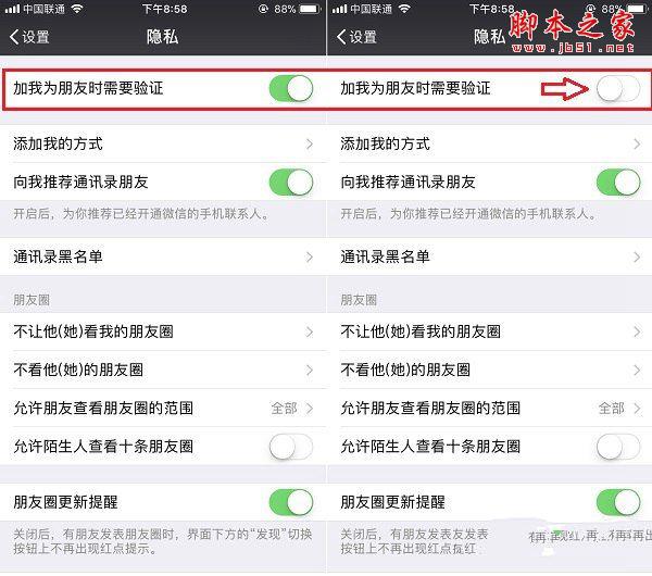 然后在隐私设置中,将默认开启的“加我为朋友时需要验证”开关,关闭就可以了,如下图所示。