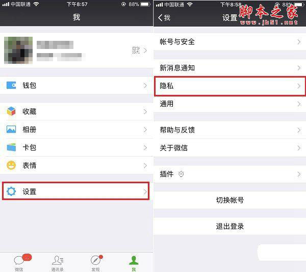 首先,在手机中打开微信,然后在「我」->「设置」->「隐私」,如下图所示。