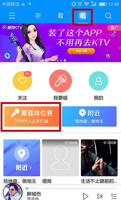 1、打开酷狗音乐app,找到“唱”版块里的“蒙面排位赛”,点击进入。