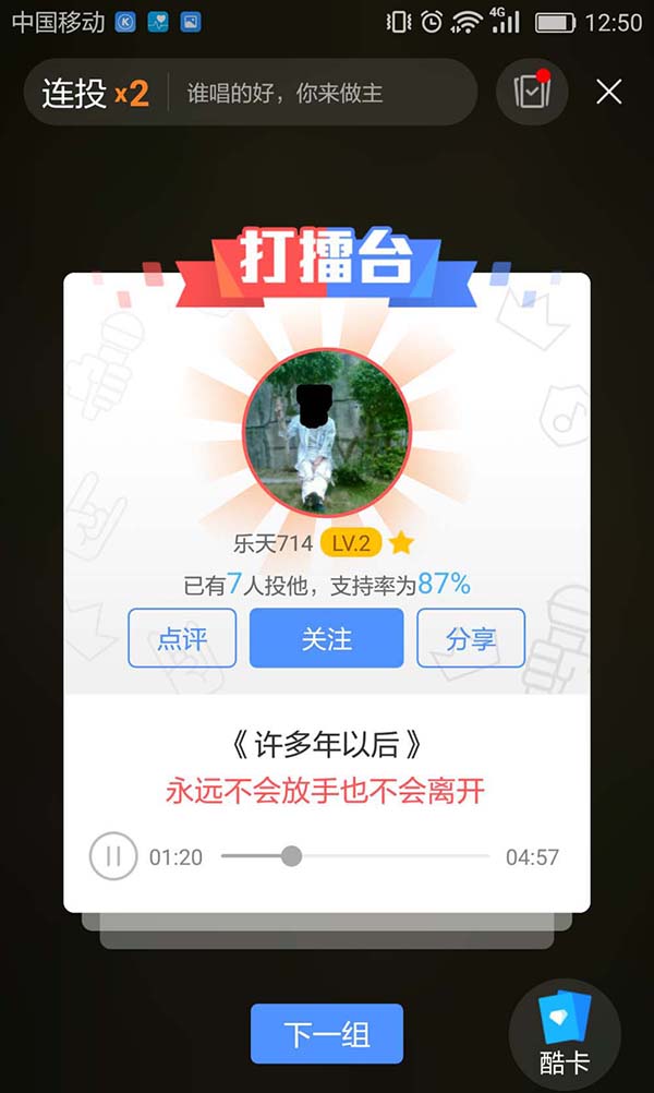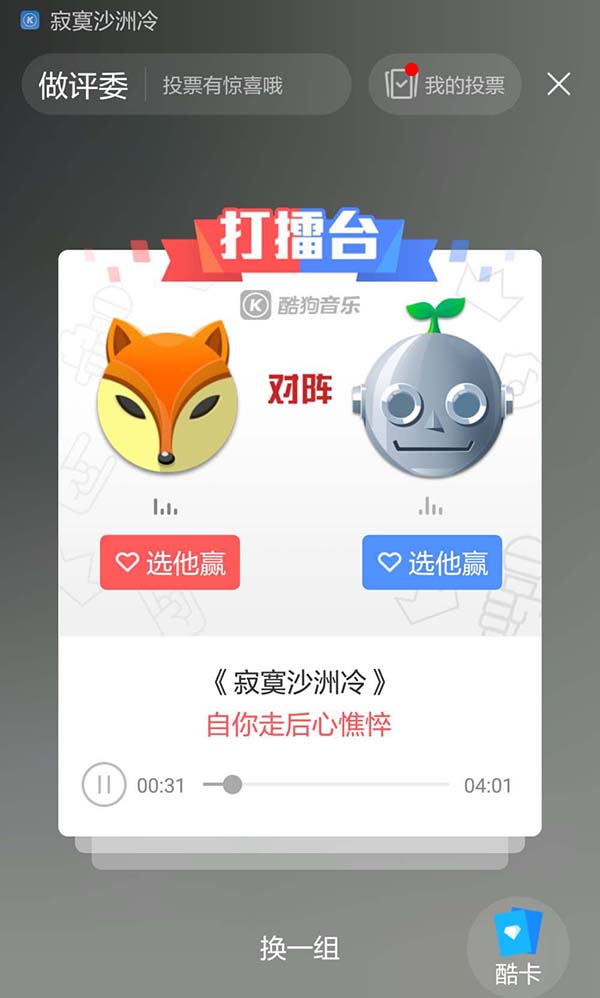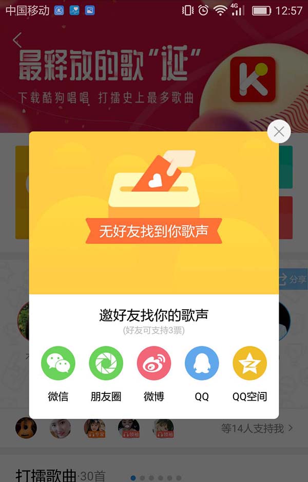 7、分享给好友后,好友会收到你的“快来找好友歌声”的邀请,然后酷狗会随机安排十组对阵选手,好友需在10组对阵中找到你唱的歌,然后再给你投票。这个小编亲测过,发现几乎没什么用,好友根本就找不到你啊。