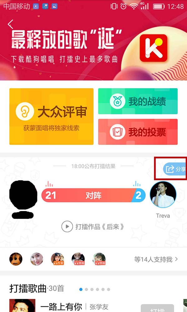 6、在对阵列表右上角有个“分享”按钮,点击即可邀请微信、QQ、微博好友为你投票助阵,但酷狗规定:好友最多可支持3票。