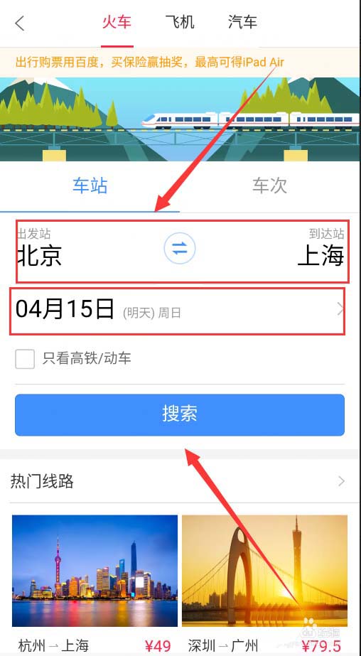 2、在火车票机票界面我们先选择自己的出发地与目的地,在选择出行日期,再点击搜索,如下图所示。