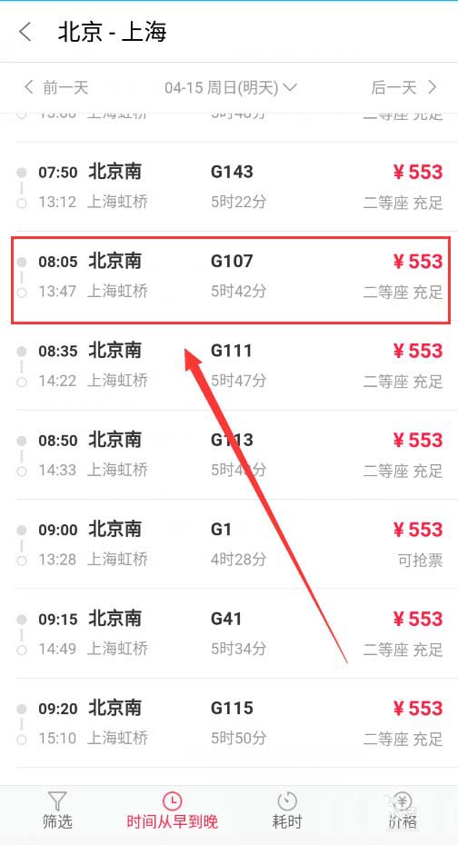 3、然后在新出现的车次信息界面中选择你要乘坐的车次,并点击进入,如下图所示。