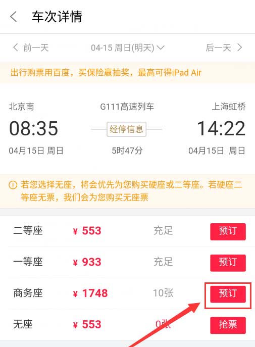 4、然后在车次详情界面选择你要乘坐的座位等级,点击预定,如下图所示。