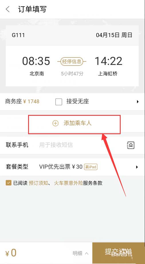 5、然后在订单填写界面选择【添加乘车人】,点击进入,如下图所示。