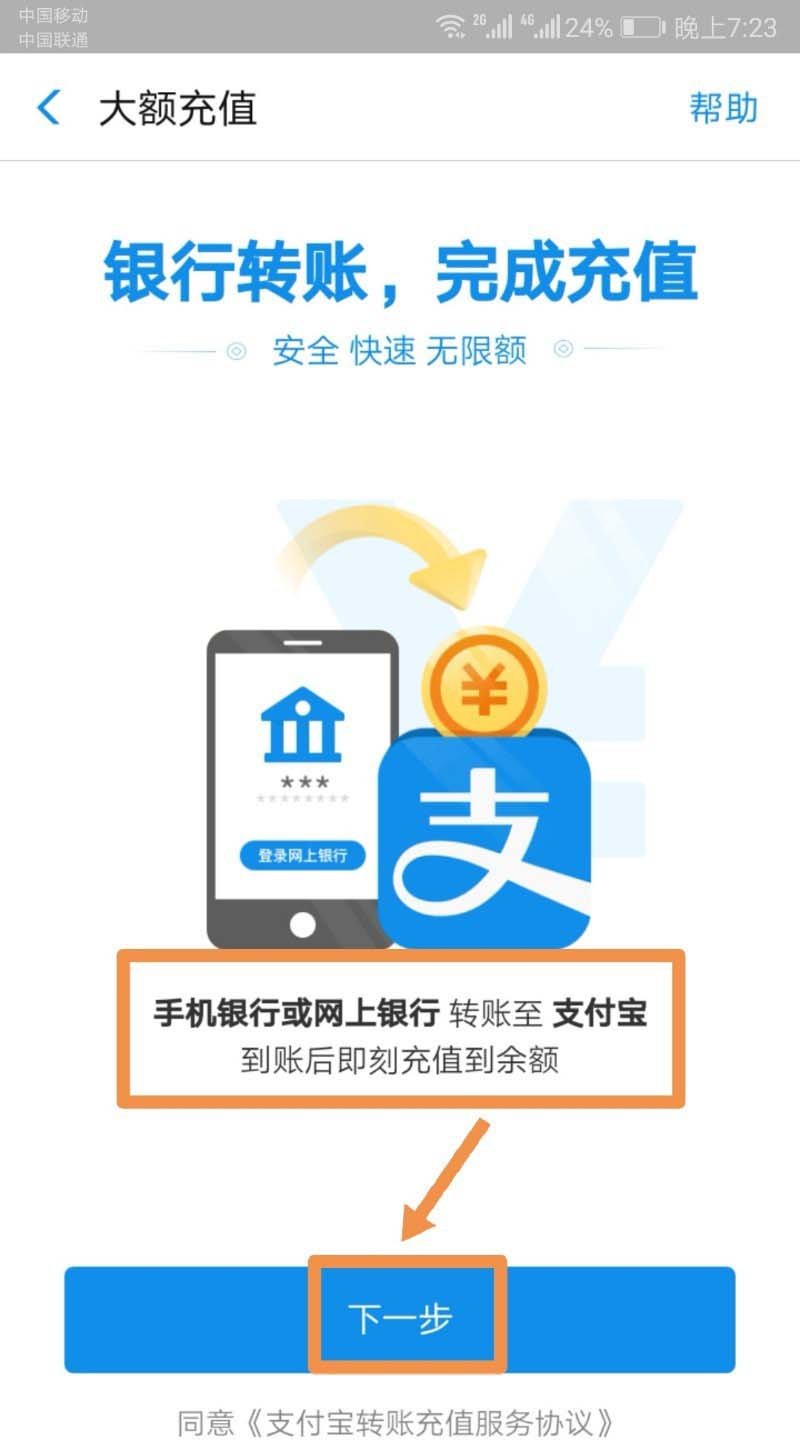 5、随后界面会进入大额充值界面,界面会弹出提示通过手机银行或者网上银行转账至支付宝到账后即刻充值到余额,点按下一步即可。