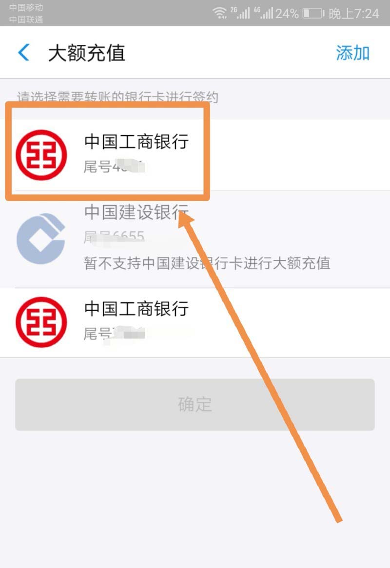6、在之后的界面中选择一个作为大额充值的绑定到支付宝上的银行卡,这里点按的是中国工商银行。