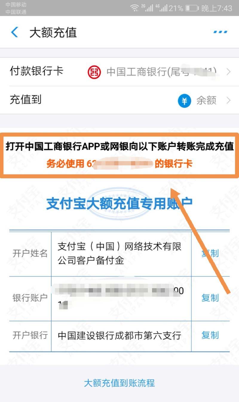 7、在随后出现的界面中会提示需要打开中国工商银行app或者使用工行网银向给定账户中充值,充值后即可即刻充值支付宝。