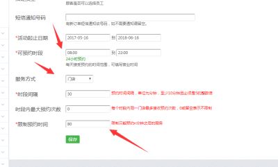 第二步:微互动---完美预约---添加预约,完善活动的设置内容,可以选择是否需要支付定金的形式,活动起止日期就是整个预约活动的时间范围;可预约时段就是预约的分时间段,和下边时段间隔搭配的,比如预约时间设置全天,时段间隔填写10的话,就是一天之内,每10分钟可以预约;时段内最大预约次数,就是每个时段内的间隔时间同一门店最多接收预约次数;限制预约时间设置0即可。
