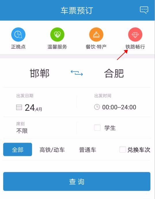 1、打开铁路12306软件,点开“铁路畅行”。如图