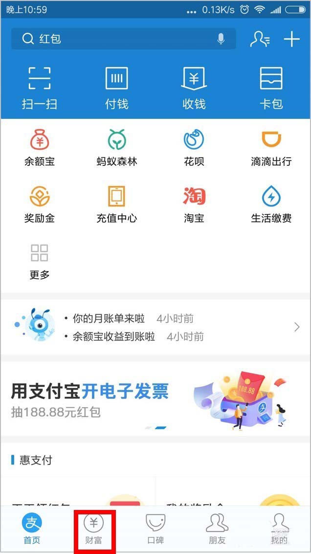 1、首先,我们打开支付宝,在主页面下方点击选择"财富"选项。