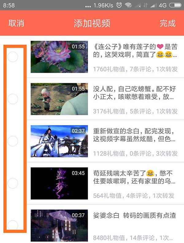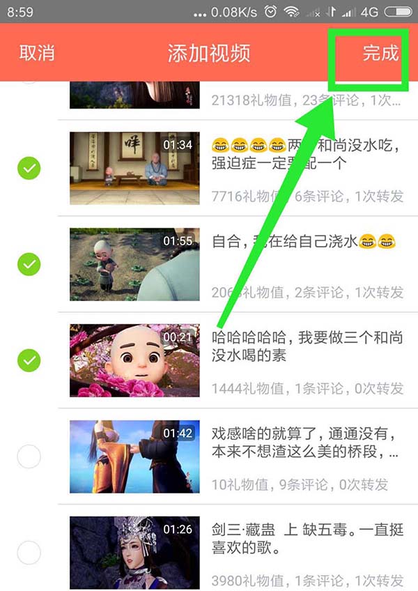 5、在『添加视频』页面点击作品前面的小圆圈,勾选你想放入合集的作品;