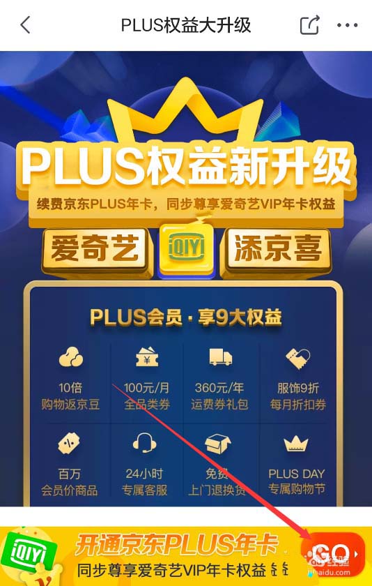 4、进入京东plus权益大升级界面后直接点击下面的【Go】,如下图所示。