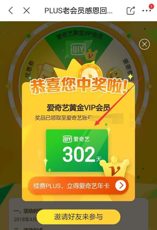 7、抽奖后会弹出恭喜您中奖啦对话框,提示你爱奇艺黄金vip会员有多少天,如下图所示。