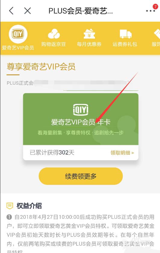 8、当然我们在京东plus会员权益里也可以看到我们已经获得的爱奇艺vip,如下图所示。