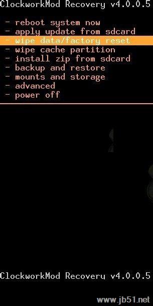 3、然后通过音量上和下,分别选择wipe data,确定(用音量键上下选择,用电源键确定),然后他会询问yes or no,果断选yes。