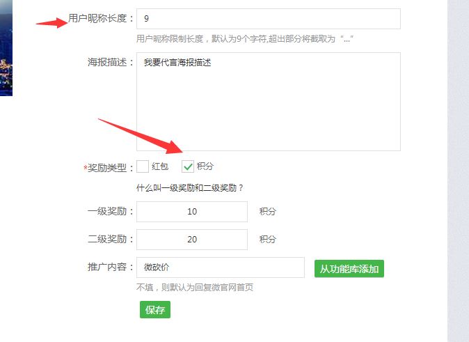 第三步:填写海报的描述,奖励的类型可以是粉丝红包或积分的形式,需要宣传的具体内容可以从后面的功能库里选择,全部填写好保存即可