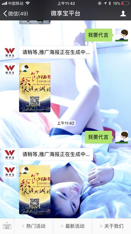 第四步:参与活动的方式,往公众号里回复活动的关键词,页面会显示请稍等,海报正在生成,将此海报分享给朋友圈或好友,即可获取相应的奖励.