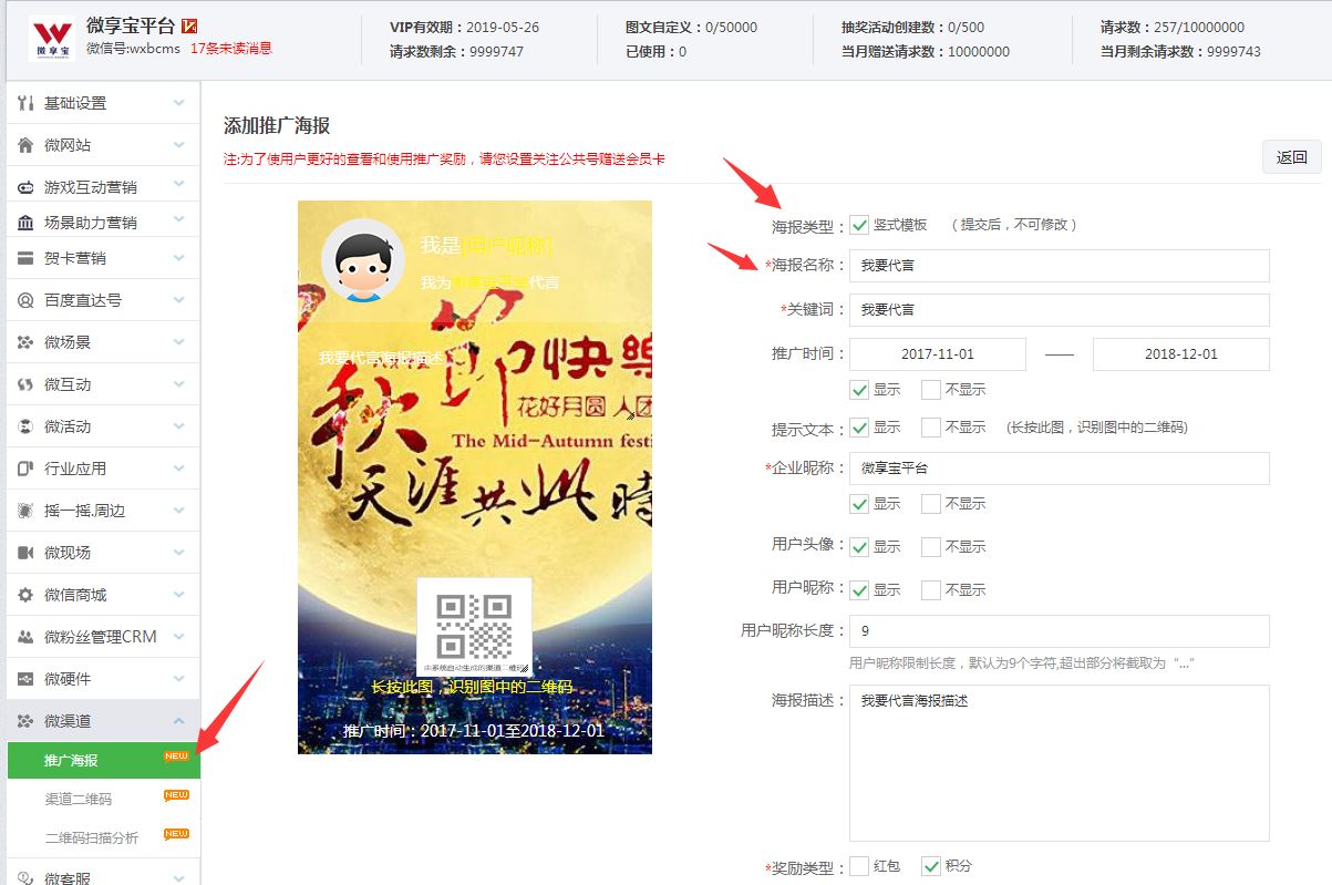 第二步:点击功能管理进入后台,在微渠道里找到“推广海报”功能,点击一下,然后点击---添加进入编辑页面,有三种模板可供选择,可自定义背景图片,根据需求勾选需要的选项.