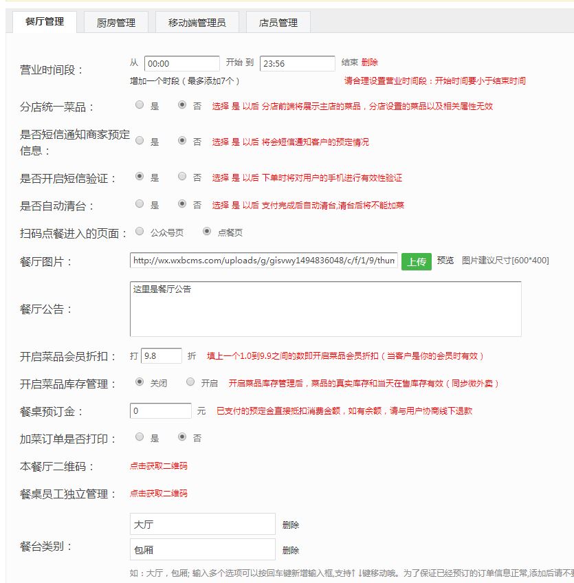 第三步:在左边功能目录下,找到行业应用--微餐饮,可以看到有很多项需要配置,分别填写每一项对应的内容,还可以实现每个餐台有独立的二维码,具体这里就不一一介绍了,配置好保存就可以了