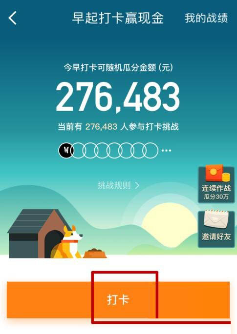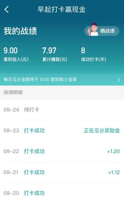5. 等到第二天早上的5:00~8:00之间,一定要记得点击进来打卡,打卡成功后就等待奖金进入小金库吧,给的金额是随机的,完全看运气。